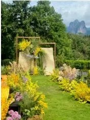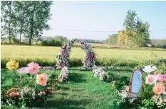 莫得千人一面的红毯铺陈,也莫得程式化的专科司仪。新娘小念身着纯洁婚纱,踩过松软青翠的草叶,慢步走向庆典区一座原木搭建的花架。花架对面,新郎徐飞早已等候在此,他死后是大片盛放的百日草,红、黄、粉、橙各色花簇交汇,成了庆典区最水灵的自然花边。