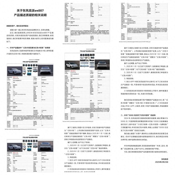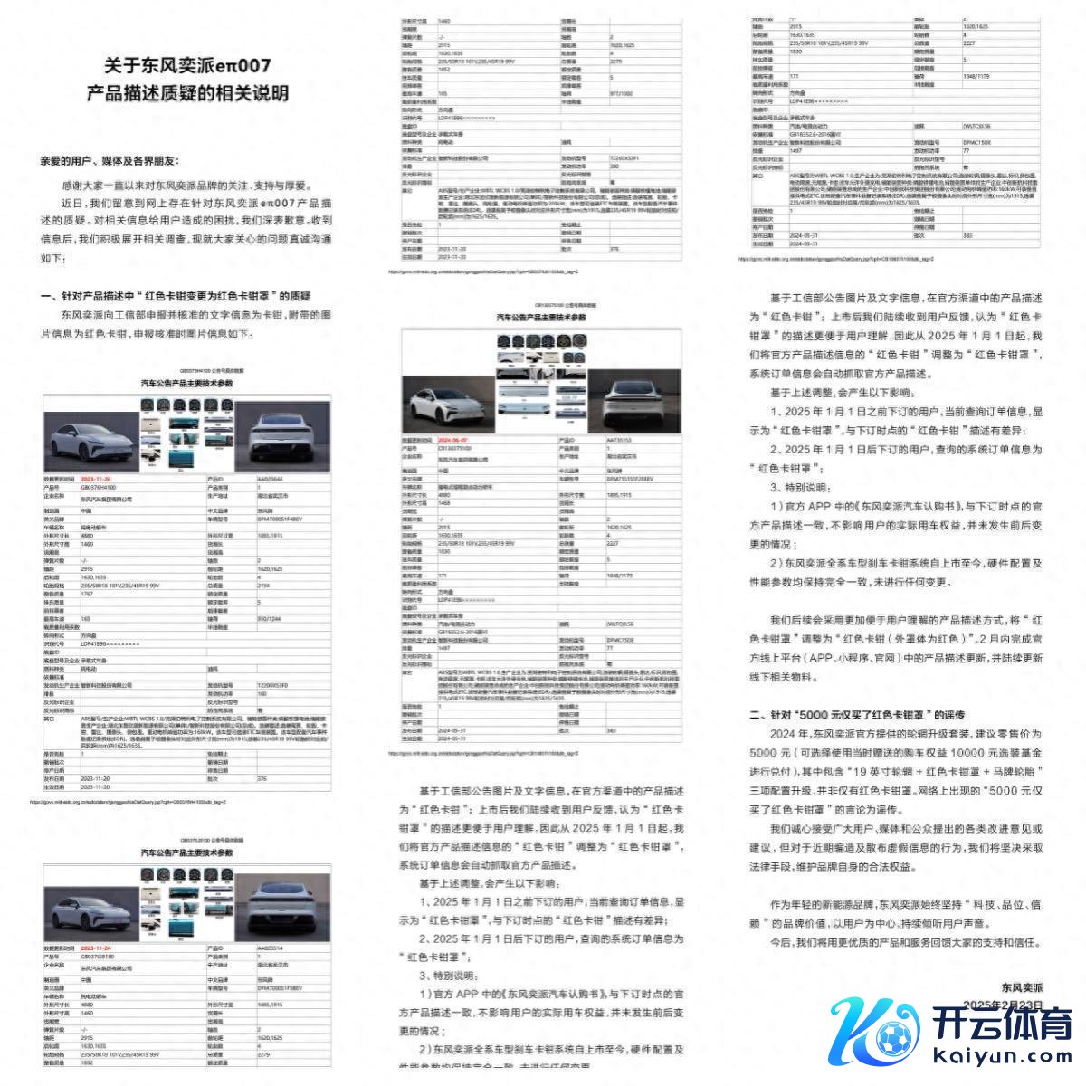 近日,东风汽车集团旗下东风奕派发布的一则“对于东风奕派eπ007居品描摹质疑的有关讲解”激发破钞者热议。到底是红色卡钳如故红色卡钳罩呢?一则情况讲解,处处彰显了东风奕派不懂法不专科。 此前,有东风奕派eπ007车主反馈称,购车时确立清单上标注为“红色卡钳”,但是实质购车时却为红色卡钳罩。以至,东风奕派片面修改了电子协议描摹,由此酿成了购买上的曲解,激发车主们的不悦。 对此,东风奕派2月23日发布声明回话,工信部讲述材料中翰墨描摹为"卡钳",图片展示为红色卡钳,2025年1月1日起为"便于用户默