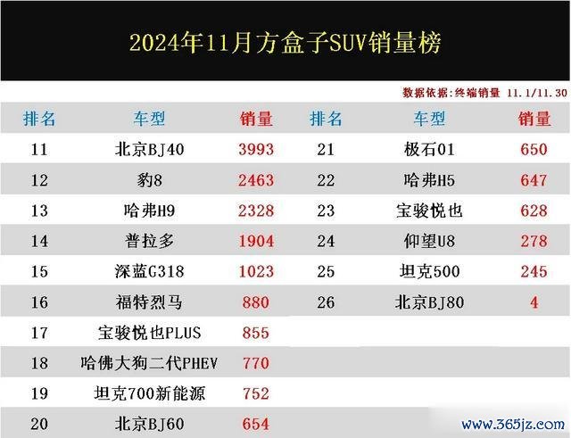 接着再来望望,北京BJ40不及4000辆,豹8,哈弗H9皆唯有2000辆凹凸,普拉多,深蓝G318进展也皆很一般,仅有1000来辆。福特烈马,宝骏悦也PLUS,坦克700新动力,北京BJ60,极石01,位居第16-第21名,销量皆在900辆以下,坦克500,北京BJ80,本月进展皆有些不尽东谈意见,均位居倒数终末两名!