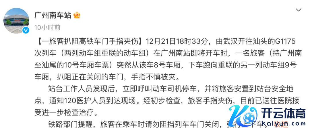12月21昼夜广泛州南车站针对此事发布通报:12月21日18时33分,由武汉开往汕头的G1175次列车在广州南站行将开车时,又名搭客倏得从该车8号车厢,下车跑向重联的另一列动车组9号车厢,扒阻正在关闭的车门,手指失慎被夹。