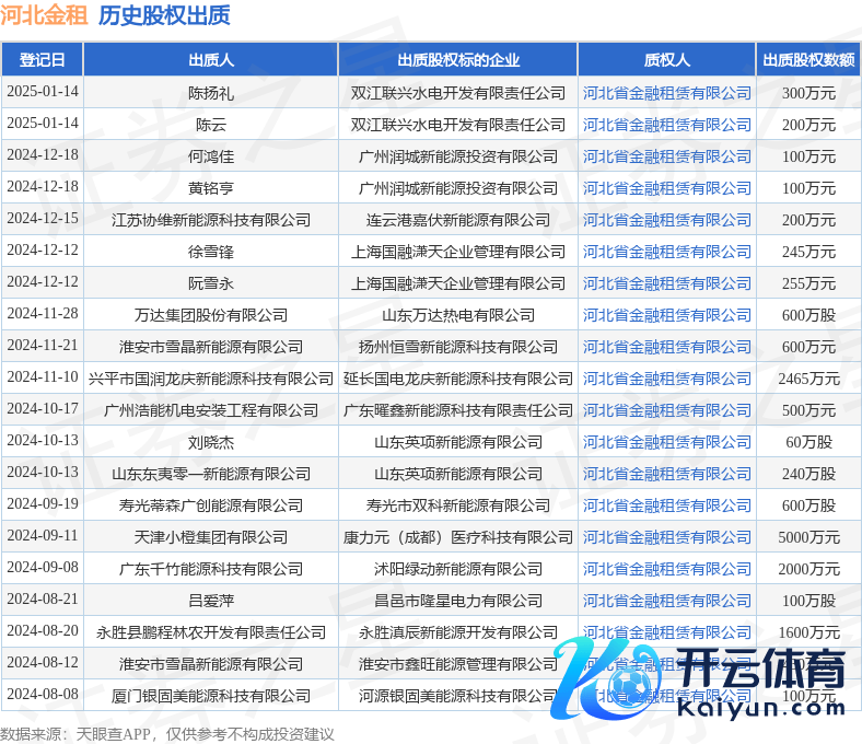 本站音讯开yun体育网,字据天眼查APP泄漏,在1月14日登记的一则股权出质信息(登记编号:530925202501150002)中,陈扬礼出质其所握有的双江联兴水电蛊惑有限牵扯公司股权,出质股权数额为300万元,质权东说念主为河北省金融租出有限公司。 河北省金融租出有限公司动作质权东说念主的股权出质历史纪录(前20条)如下: 河北省金融租出有限公司树立于1995年12月10日,法定代表东说念主为徐敏俊,注册成本500000万东说念主民币,指标限制包含:融资租出业务;转让和受让融资租出金钱;固