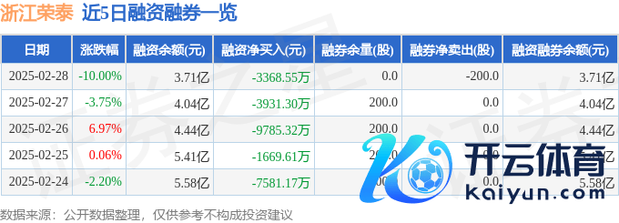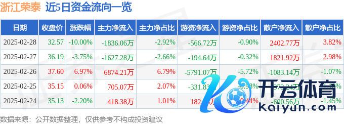 本站音信,为止2025年2月28日收盘,浙江荣泰(603119)报收于32.57元,下落10.0%,跌停,换手率9.24%开yun体育网,成交量18.83万手,成交额6.29亿元。