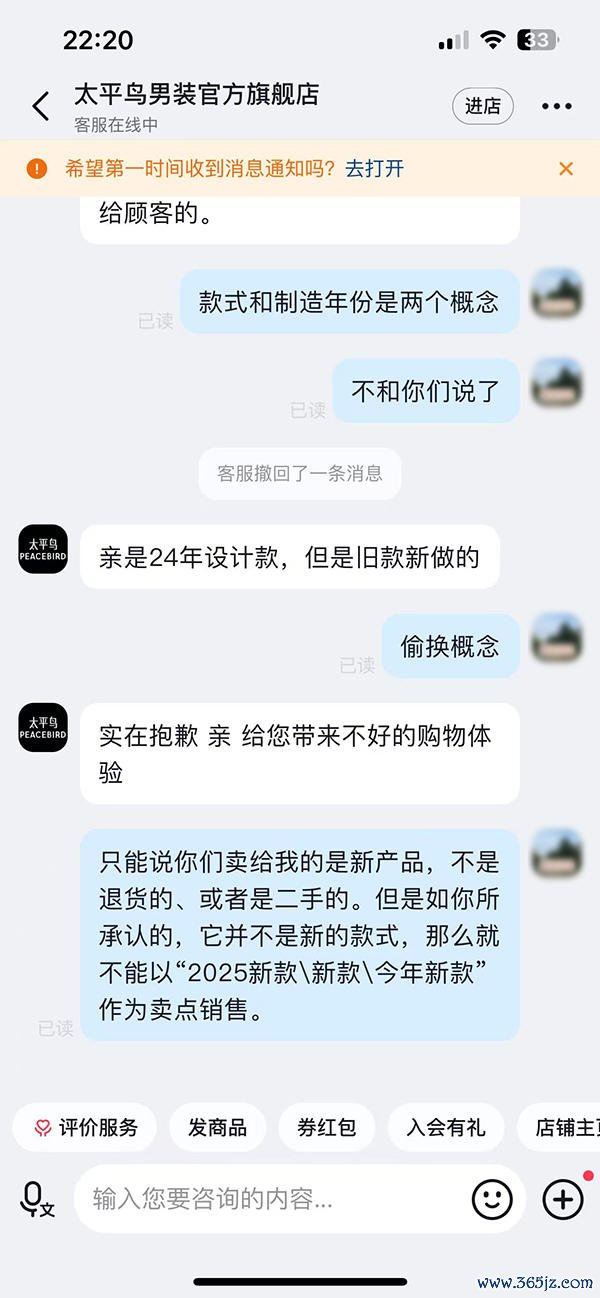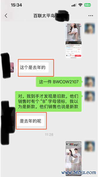 周先生说,新款两个字对他变成了严重误导,并涉嫌造作宣传。发现问题后,周先生专诚通过微信计划了太平鸟店铺责任主说念主员,聊天记载清晰,经责任主说念主员对比查找,证实周先生购买真的为2024年的旧项目。