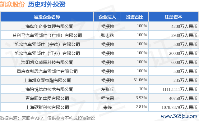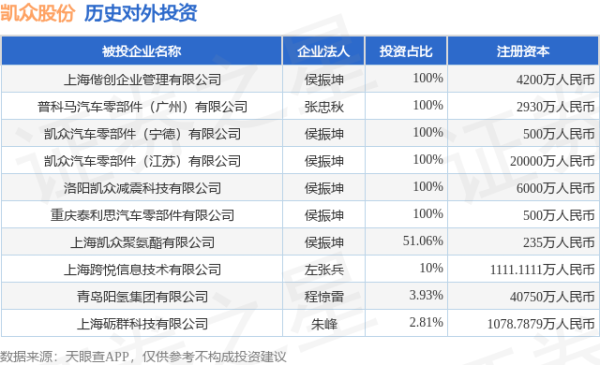 本站音书,凭据天眼查APP表示,凯众股份(603037.SH)新增通盘对外投资事件,被投资公司为青岛阳氢集团有限公司,法定代表东谈主程惊雷,投资占比为3.93%。该公司从事石油、煤炭过火他燃料加工业,注册成本为40750万东谈主民币。现在欧洲杯体育,凯众股份共存在对外投资10项,详见下表: