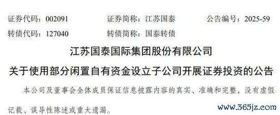 2023年8月25日,江苏国泰董事会审议通过议案,同意公司及同一报表范围内子公司使用闲置自有资金开展证券投资,投资总数不跳跃10亿元(含)。