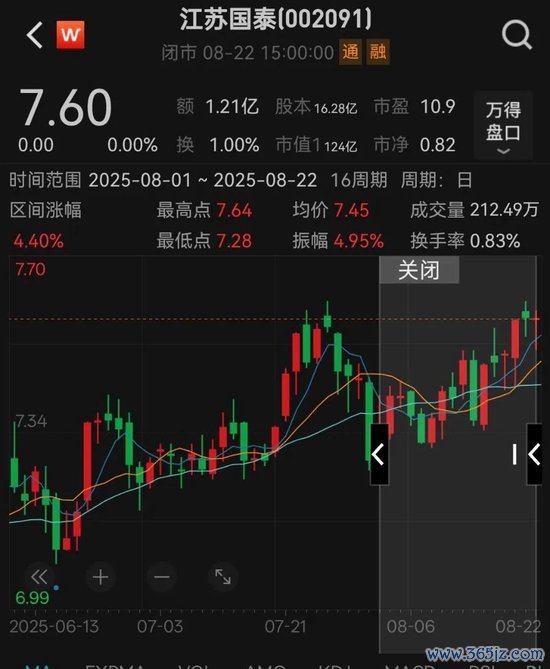 扬弃8月22日收盘,江苏国泰股价报7.6元/股,总市值为124亿元,8月以来股价涨幅为4.4%。