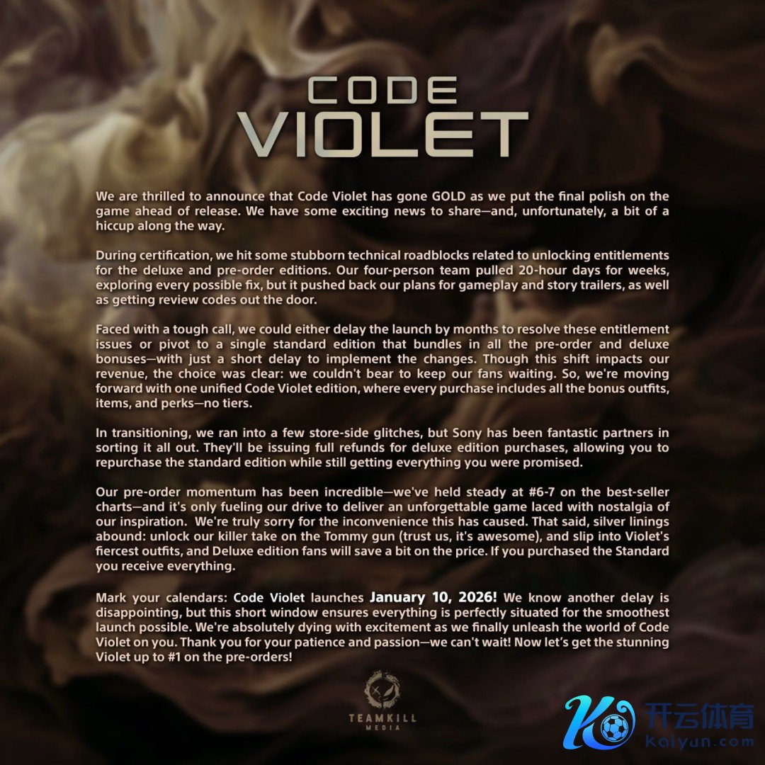 第三东谈主称算作恐怖游戏《Code Violet》原定于12月12日发售,独占登陆PS5。近日成立商TeamKill Media秘书本作再次跳票体育游戏app平台,脱期至2026年1月10日发售。 官方默示《Code Violet》在进行终末的打磨,但遭受一些技巧贫寒,波及到豪华版和预购版职权解锁。官方面对辛劳抉择:要么将游戏发售延后数月,透顶处均职权问题。要么有顷脱期,将通盘预购与豪华版实质整合成长入的尺度版。 对此官方作念出决定,将推出长入的《Code Violet》版块,每一份购买都将包