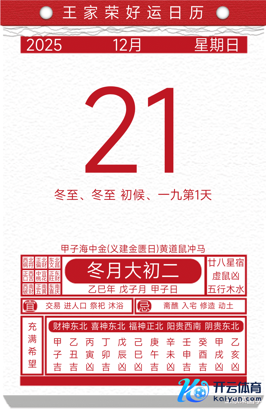 农历日历:二零二五 乙巳蛇年 冬月大初二体育游戏app平台 本日骨气:冬至 下一骨气:(小寒,(1,5),2026) 所属季节:仲冬 本日八字:乙巳 戊子 甲子 甲子 时干:甲,乙,丙,丁,戊,己,庚,辛,壬,癸,甲,乙 时支:子,丑,寅,卯,辰,巳,午,未,申,酉,戌,亥 时吉:吉,吉,凶,吉,凶,凶,吉,凶,吉,吉,凶,凶,凶 生肖冲煞:鼠冲马 本日星座:弓手座 星次:星纪 彭祖百忌:甲不开仓,子不问卜 逐日通书福祸宜忌2025年12月21日 十二值神:(建,金贵,黄说念吉日) 廿八星宿: