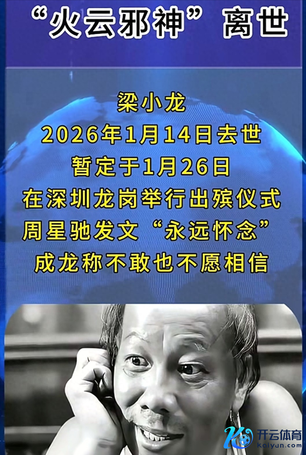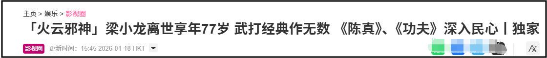2026年1月18日,港媒证实,有名功夫影星梁小龙依然于1月14日在深圳耗损,享年77岁。