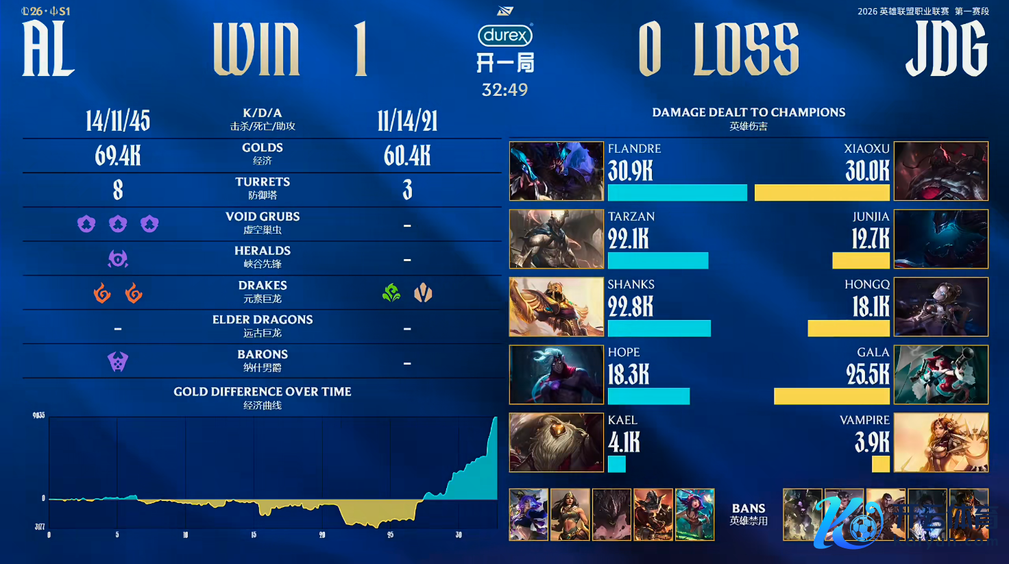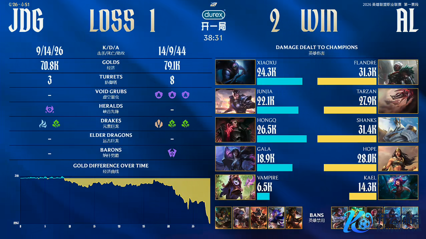 进程漫长的休整期之后,重组的LPL 2026第一赛段终于在1月14日,细腻拉开序幕。各支重组之后的队伍开yun体育网,将向第一赛段的冠军发起挑战,超越辅导一下,第一赛段的冠军有80点的积分哦。 按照赛程安排,1月31日的比赛,由两场比赛构成,JDG对阵AL,以及BLG大战IG构成。谁能赢下比赛,让咱们一皆来看一下吧 AL三局校服JDG 第一局比赛,AL蓝色方,禁用:妮蔻;兰博;石头东说念主;希维尔;芸阿娜,采取:Flandre挖掘机;Tarzan潘森;Shanks沙皇;Hope韦鲁斯;Kael