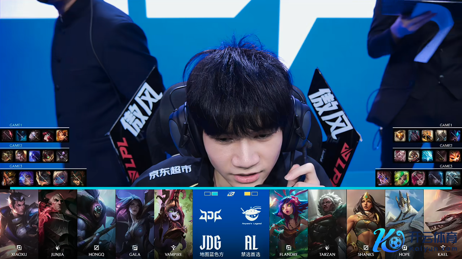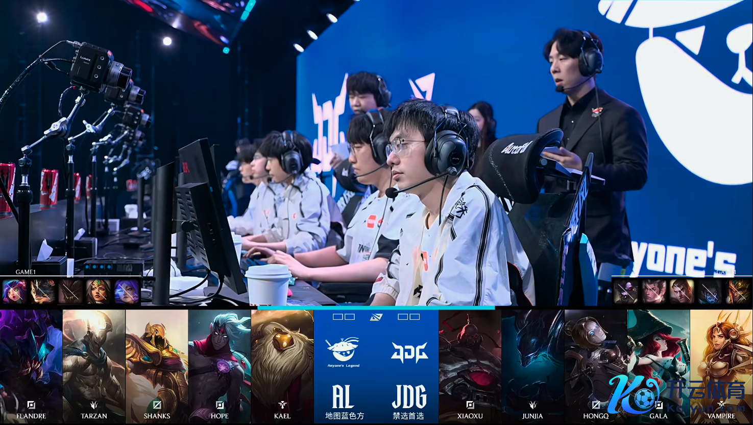 第一局比赛,AL蓝色方,禁用:妮蔻;兰博;石头东说念主;希维尔;芸阿娜,采取:Flandre挖掘机;Tarzan潘森;Shanks沙皇;Hope韦鲁斯;Kael巴德;JDG红色方,禁用:皇子;塞拉斯;杰斯;赵信;毒头,采取:Xiaoxu塞恩;JunJia梦魇;HongQ发条;GALA女枪;Vampire蕾欧娜