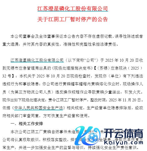 中新经纬10月21日电 澄星股份21日公告体育游戏app平台,江阴工场暂时停产。 澄星股份公告截图 澄星股份称,10月20日收到无锡市救急处治局出具的《现场处理纪律决定书》提到,10月20日现场查验时,发现公司有下列违法违法举止和事故隐患:公司进行黄磷罐车罐箱内黄磷溶化功课时,现场操作主谈主员(为第三方物流公司东谈主员)违抗操作规程功课导致黄磷少许溢出,激勉失火。 现作出如下现场处理决定:责令江阴工场暂时停产,整改时限:11月20日。依据《中华东谈主民共和国安全分娩法》关连轨则,分娩方向单元隐