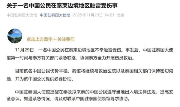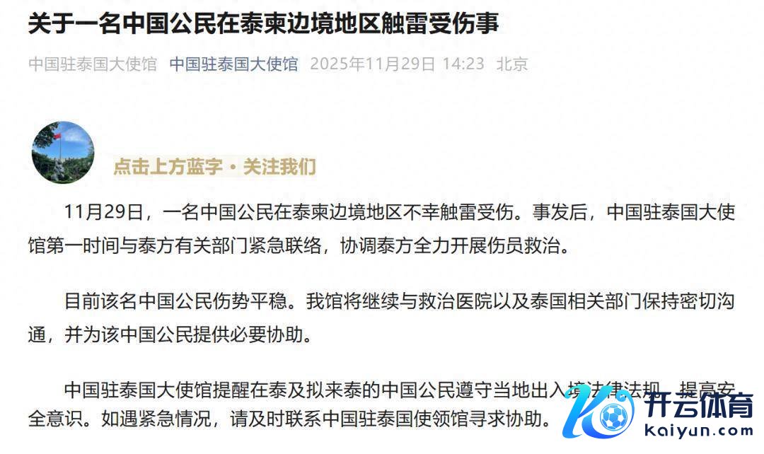 11月29日,别称中国公民在泰柬边境地区厄运触雷受伤。事发后开yun体育网,中国驻泰国大使馆第一时辰与泰方考虑部门伏击集结,协作泰方全力开展伤员救治。