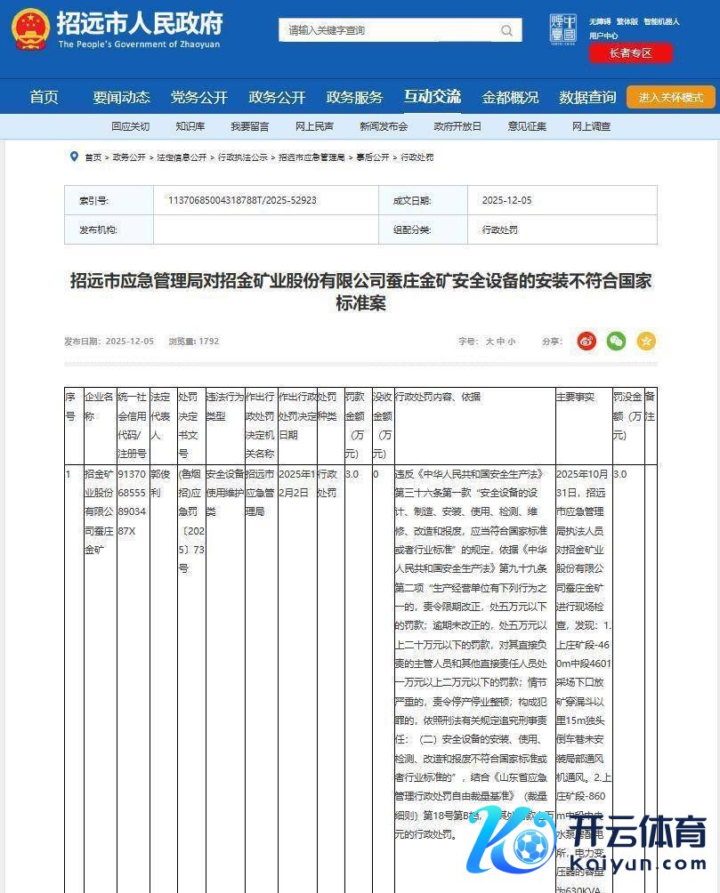 此外,据信网2025年8月报谈,招远市济急不休局对招金矿业股份有限公司蚕庄金矿开出罚单开云体育,因其未落实济急预案法例的济急物质及装备,被处以罚金2.5万元。处罚决定书裸露,招金矿业股份有限公司蚕庄金矿在分娩宗旨历程中,未能按照济急预案的条款配备必要的济急物质及装备。招远市济急不休局对招金矿业股份有限公司蚕庄金矿处以罚金2.5万元。