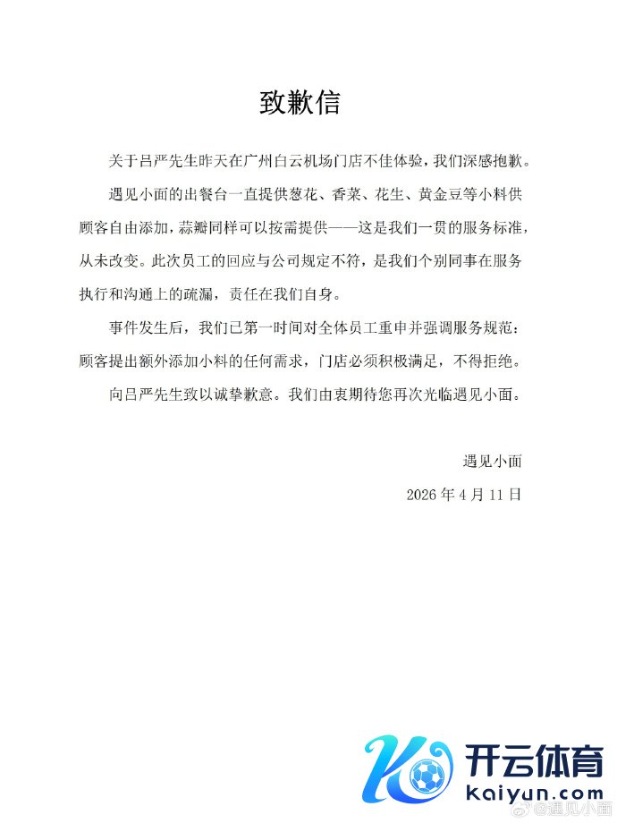 演员吕严4月10日晚发布的视频透露,他在碰见小面就餐时,到柜台给面加葱花,职业东谈主员称“这里不是自助的”。吕严转而请职业东谈主员给他加点儿,职业东谈主员示意“这个加不了”。 4月11日,碰见小面发布致歉信称,就吕严昨天在广州白云机场门店欠安体验,深感对不起。 碰见小面示意:碰见小面的出餐台一直提供葱花、香菜、花生、黄金豆等小料供顾主开脱添加,蒜瓣雷同不错按需提供——这是咱们一贯的职业法式,从未蜕变。这次职工的讲演与公司国法不符,是咱们个别共事在服求实行和相通上的裁汰,背负在咱们自己。 碰见小