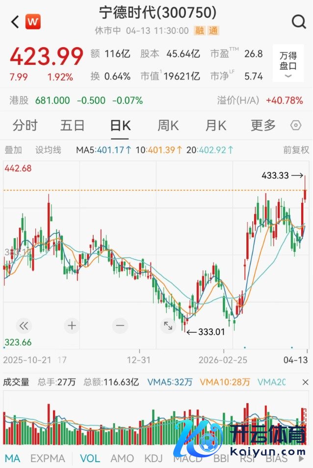为止午盘,宁德期间报423.99元/股,最新市值为19621亿元。
