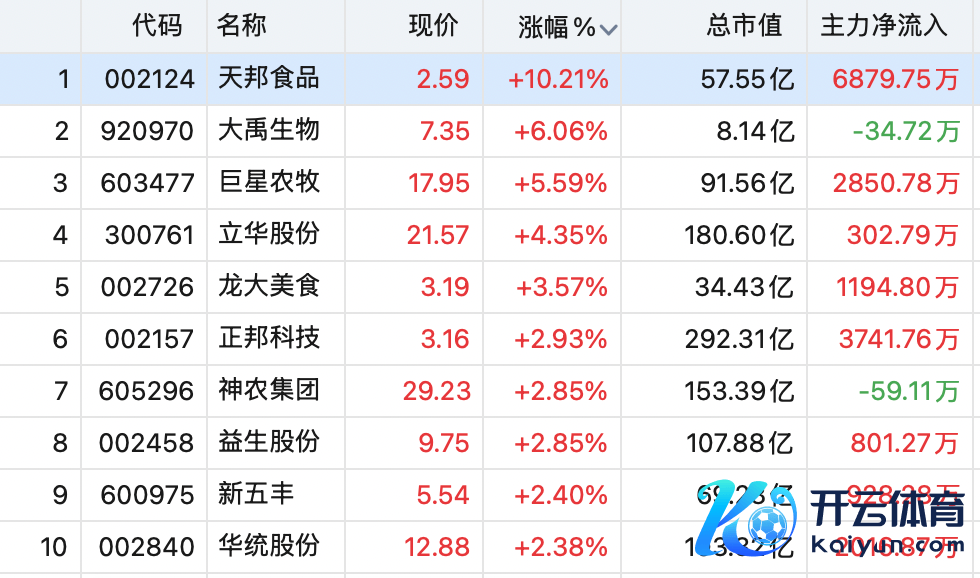 牧原股份涨超2%。天邦食物录得10cm涨停,大禹生物涨超6%,巨星农牧涨超5%,立华股份涨超4%,龙大好意思食、新五丰、神农集团、益生股份、正邦科技等纷繁高潮。
