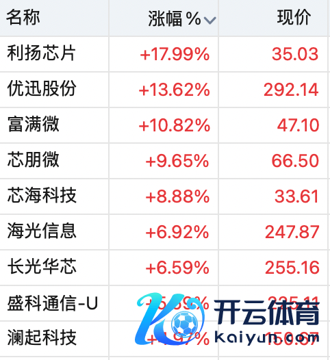 寒武纪涨1.51%,最新股价报1229.01元/股;摩尔线程涨1.97%,利扬芯片涨近18%,优迅股份涨超13%,富满微、芯一又微、芯海科技、长光华芯等涨幅彰着。