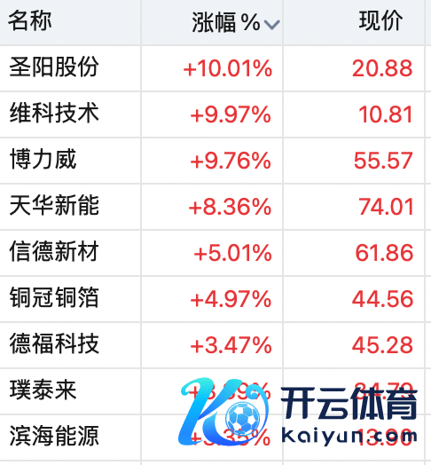 圣阳股份录得3连板,维科技艺录得10cm涨停,博力威靠拢涨停,天华新能涨超8%,信德新材、德福科技等跟涨。