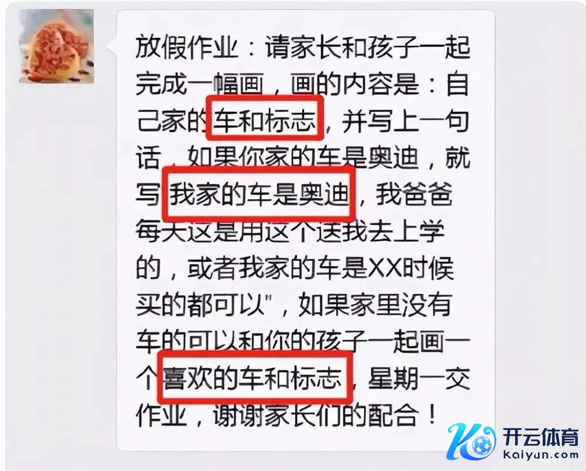 可当幼儿园拿亲子功课当幌子,推行上却是为了探查孩子们的家庭实力时,这种亲子功课也就变了滋味,当功课内容触及家庭住址、房屋性质、住房面积,致使要求标注汽车品牌时,这么的功课早就成了就业和导火索。